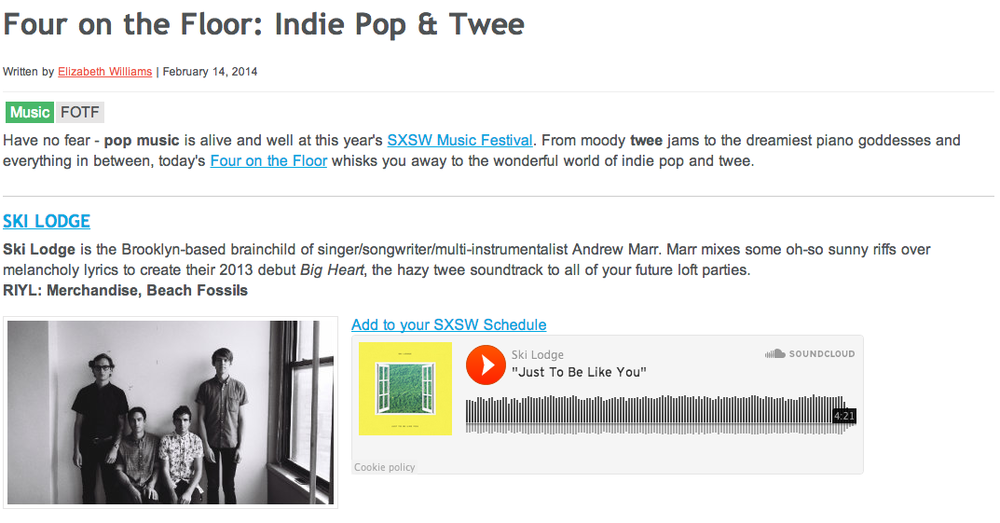 February 17, 2021 SKI LODGE Featured on sxsw.com February 17, 2021 SKI LODGE check out the full post here: http://sxsw.com/music/news/2014/four-floor-indie-pop-twee SKI LODGE B-Side "The Gun" Premiers on FILTER Two shows supporting Tennis this May!